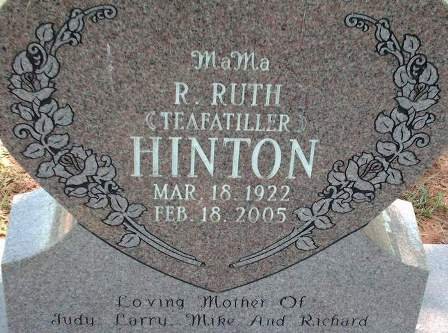 Memorial graveside rites for Ruth Hinton, 82, of Thackerville, were held at 2 p.m., Monday, February 21, with a private burial service held February 18, in the Mt. Zion Cemetery, Thackerville. Arrangements were directed by Harvey-Douglas Funeral Home, Ardmore.