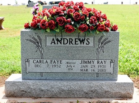 Jimmy leaves behind: His wife, Carla, of the home; His daughter, Julie Hoisington and husband Dustin of Norman, and their son, Beau Gunner Hoisington; His son, Derek Andrews of Washington; Sisters, Mary Dover and husband Joe of Purcell and Carolyn Cheek and Danny Blubaugh; Brothers, Lem Andrews and Mary Walker of Purcell and Billy Andrews and wife Becky of Goldsby; His "inherited" daughter, Amy Harryman and her husband James and their children, Brooke and Blaine; Brother in law, Floyd Cox of Noble, and many other family and friends.
