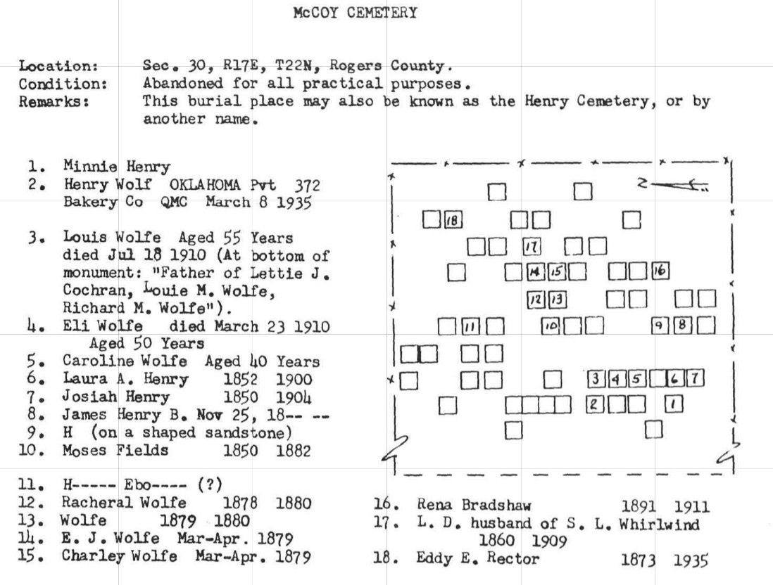 © 2000-2026 Oklahoma CemeteriesThe information on this site is provided free for the purpose of researching your genealogy. This material may be freely used by non-commercial entities, for your own research, as long as this message remains on all copied material. The information contained in this site may not be copied to any other site without written "snail-mail" permission. If you wish to have a copy of a donor's material, you must have their permission. All information found on these pages is under copyright of Oklahoma Cemeteries. This is to protect any and all information donated. The original submitter or source of the information will retain their copyright. Unless otherwise stated, any donated material is given to Oklahoma Cemeteries to make it available online. This material will always be available at no cost, it will always remain free to the researcher.