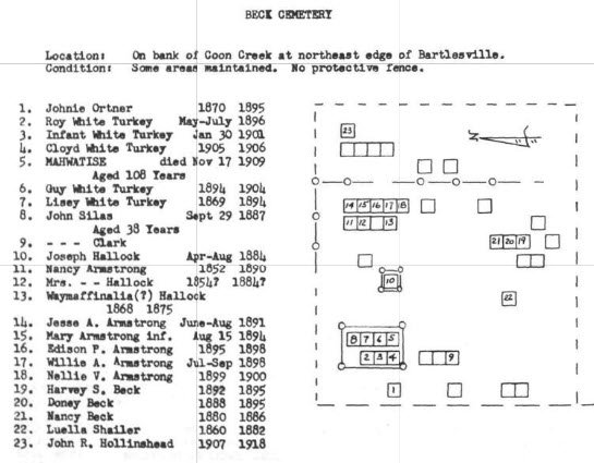© 2000-2026 Oklahoma CemeteriesThe information on this site is provided free for the purpose of researching your genealogy. This material may be freely used by non-commercial entities, for your own research, as long as this message remains on all copied material. The information contained in this site may not be copied to any other site without written "snail-mail" permission. If you wish to have a copy of a donor's material, you must have their permission. All information found on these pages is under copyright of Oklahoma Cemeteries. This is to protect any and all information donated. The original submitter or source of the information will retain their copyright. Unless otherwise stated, any donated material is given to Oklahoma Cemeteries to make it available online. This material will always be available at no cost, it will always remain free to the researcher.