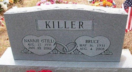 Nannie was preceded in death by her parents, her husband; Bruce Killer, her son; Jackie Dean Still, grandson; Byron Dean Still, 2 brothers; Cicero Still and Frank Still, 2 sisters; Lucy Johnson and Anna Coulson.