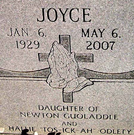© Carnegie Herald Carnegie, Oklahoma Wednesday, May 9, 2007 Thelma Joyce [Guoladdle] Aitson 1929 ~ 2007 Funeral services for Thelma Joyce Aitson, 78, of Carnegie will be held Wednesday, May 9, 2007 at 10:00 a.m. at the Cedar Creek United Methodist Church in Carnegie with Rev. Milton Otis officiating. Prayer services were held Tuesday, May 8, 2007 at 7:00 p.m. at the Carnegie-Pitcher Funeral Home in Carnegie. Thelma was born January 6, 1929 to Newton and Hallie [Odelty] Guoladdle in Carnegie and died Sunday, May 6, 2007 at the Carnegie Hospital. She has lived in Carnegie her entire life. She was united in marriage to William Aitson in 1947 in Carnegie and from this union was born five children. Joyce enjoyed her family, especially her children and grandchildren, they were her whole life. She enjoyed gardening, yard work, cooking and housekeeping. Other than her family her greatest joy was sewing and there isn't anything she couldn't sew. She quilted, did needlepoint and crocheting. Her only complaint was not being able to see well enough to sew anymore after her stroke a few years ago. After her son, Lucius "Yogi" was called home by the Lord, she went to the cemetery nearly everyday to make sure their lot was properly kept, it was very important to her. Then when God called one of her daughters, Cheryl and shortly after Joyce's husband, William, it was a must that their lot at the cemetery be well maintained and she and the girls and grandkids made a visit almost every day to see that it always looked nice. Joyce was a wonderful wife, Mom, grandma, sister and friend. She was proud of her Native heritage and a member of the Kiowa Indian Tribe of Oklahoma. She was a born again believer and was very thankful for all God had blessed her with. She taught her family well and always stood by their side. She will be greatly missed by all who knew and loved her. She leaves a great legacy to be followed by her children and grandchildren. She is survived by three daughters, Lydia Arocha, Sharon Aitson, both of Carnegie and Jerwel Tawkoyty of Oklahoma City; two grandsons, William Tawkoyty of Oklahoma City and Joey Arocha of Carnegie; and two granddaughters, Hattie Shalaine Aitson and Tosickah Joyce Arocha of Carnegie. She was preceded in death by her parents, Newton and Hallie Guoladdle; one son, Lucius B. "Yogi" Aitson; one daughter, Cheryl Aitson; her husband, William Aitson; two sisters, Esther Prentiss and Elouise Geionty; and five brothers, Arthur, Frank, Edgar, Joe and Robert Guoladdle. Burial will be in the Carnegie Cemetery under the direction of the Carnegie-Pitcher Funeral Home. Thelma Joyce [Guoladdle] Aitson January 6, 1929 ~ May 6, 2007 |
