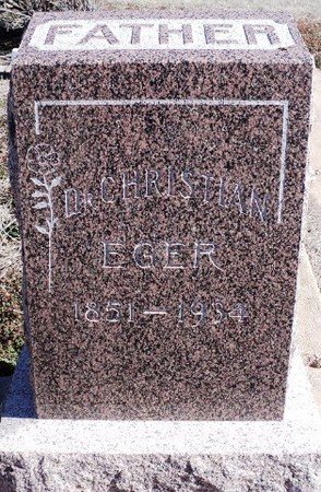Funeral services for Dr. Christian Eger, 83, retired physician, who passed away at his home in Fairmont early Saturday morning, March 24, were held from the Zion Lutheran church Tuesday afternoon with Rev. H. Mueller, pastor, conducted the services and the remains were interred by the side of his wife, who preceded him in death several years ago, in the Collett cemetery north of Fairmont. Dr. Eger fell and fractured his hip several weeks ago and the accident ultimately caused his death. He and his family have been residents of Fairmont for 37 years. He served as postmaster for many years, retiring a few years ago. He is survived by three sons, Bill Eger who resides in Michigan, John Eger of Kremlin and Adali Eger of the home in Fairmont, two daughters, Miss Lena Eger of the home and Mrs. Theresa McCormick of Muskegan, Michigan, several grandchildren and also two sisters.