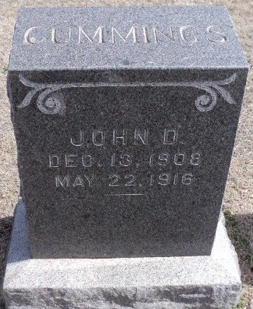 Johnnie Cummings was born December 13th, 1908, and died May 22, 1916, age 8 years, 5 months and 9 days. He had spent his short life on the same place and was loved by all his school mates being a very bright disposition.