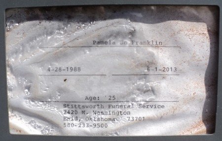 ENID, Okla. - Funeral service for Pamela Jo Franklin, 25, of Lahoma, will be 2 p.m. Friday, June 7, 2013, at World Harvest Church, with Pastor Brad Mendenhall officiating. Committal prayers and interment will follow in Lahoma Cemetery under the kind guidance of Stittsworth Funeral Service. Visitation with family 6-8 p.m. tonight at Stittsworth Funeral Service.