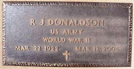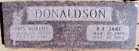 R.J. (Jake) Donaldson went to be with his Lord, on Thursday, March 12, 2004. He was born March 22, 1922, to A.W. and Amy Lee Cartmell Donaldson in the Fairmont area. He was one of eight children and the three youngest sons (Tom, Don and Jake) are still remembered for their mischievous antics. (They referred to themselves as the "Dalton Boys", and oh, the stories they have told!)