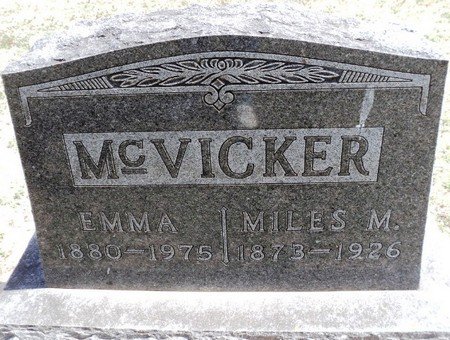 Mrs. McVicker was born February 1, 1880, near St. Joseph, Missouri, and came to Oklahoma during early statehood. She grew up east of Hennessy and was married to Col. Miles McVicker on September 13, 1895. They moved to Waukomis in 1908 where he was in the auctioneer business. He died in 1925.