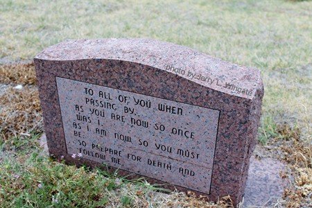 The information on this site is provided free for the purpose of researching your genealogy. This material may be freely used by non-commercial entities, for your own research, as long as this message remains on all copied material. The information contained in this site may not be copied to any other site without written "snail-mail" permission. If you wish to have a copy of a donor's material, you must have their permission. All information found on these pages is under copyright of Oklahoma Cemeteries. This is to protect any and all information donated. The original submitter or source of the information will retain their copyright. Unless otherwise stated, any donated material is given to Oklahoma Cemeteries to make it available online. This material will always be available at no cost, it will always remain free to the researcher.
