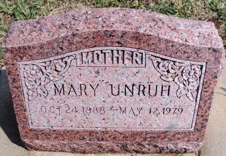 Mrs. Unruh, the former Mary Jantz, and was born October 24, 1888, at Moundridge, Kansas. Her mother died when she was born, and she was raised by Mr. and Mrs. Henry J. Nightengale. Mrs. Nightengale was a cousin. In 1904, she was baptized in the Emmanuelle Mennonite Church of Moundridge, Kansas, the former Canton Mennonite Church organized October 1, 1875.
