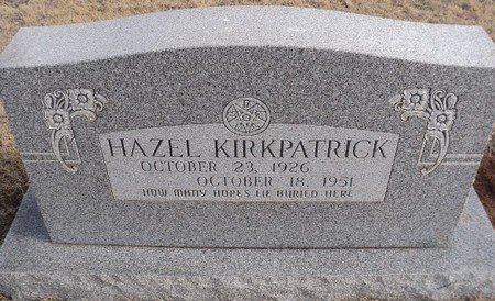 Among those who mourn her going are her husband, Reuben "Kirk" Kirkpatrick; five sisters: Mrs. Volney Woodruff of Douglas Oklahoma, Mrs. Bill Neice and Mrs. J. A. Joplin of Wichita Kansas, Mrs. J. H. Howerton of Brownfield Texas, and Dorothy Stiles of the home; Her father and mother Mr. and Mrs. H.E. Stiles of Lambert Oklahoma, and two brothers Harold Jr. and Larry of the home.
