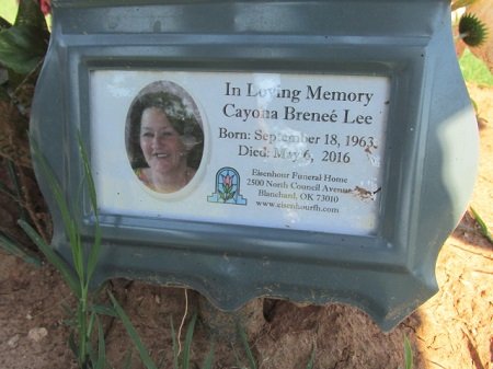 Cayona Breneé Lee, 52, of Newalla, died Friday, May 6, 2016, in Oklahoma City. The daughter of Albert Paul Bolner and Yvonnie Imogene (Clark) Bolner, she was born September 18, 1963 in San Jose, California.