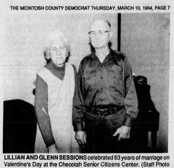 Survived By: Husband of 74 years: Glenn Sessions of the home, 2 Sisters: Lois Lane and Lora Shay of Tulsa, OK, 14 Nieces and Nephews, Numerous grand and great grand nephews and niecesInterment will follow at the Lackey Cemetery, Hitchita, Ok under the direction of the Rogers Funeral Home.