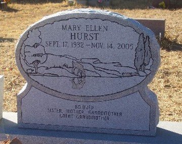 Mary Ellen Hurst, 73, of Gore, formerly of Bakersfield, CA died Monday, November 14, 2005 in Muskogee, Oklahoma. Funeral services will be held at 11:00 a.m., Saturday, November 19, 2005, at the Checotah Church of God East of Checotah officiated by Pastors Clyde Westberry and Tim Whisenhunt. Burial will follow in Noley Cemetery, Nashoba, Oklahoma under the direction of Smith Funeral Home of Checotah.