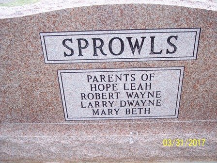 He is survived by 4 children, Hope (John) Nienhuser, Houston, TX, Dr. Robert (Linda) Sprowls, Amarillo, TX, Dr. Larry Sprowls, Ft. Worth, TX, and Mary (Marty) Cook, Sayre, OK; 10 grandchildren, 17 great grandchildren; 1 brother, Louis (Maxine) Sprowls, Oklahoma City, OK; 2 sisters-in-law, Dolly Green, Moore, OK and Elsie Green, Elk City, OK and a host of other relatives and friends.
