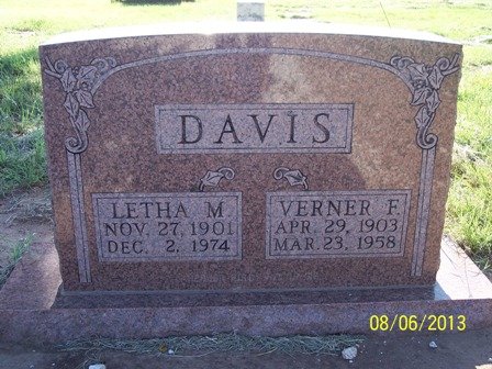 Vernor Floyd Davis, son of W. G. and Messia Davis, was born at Crawford, Oklahoma, April 29, 1903, and departed this life March 23, 1958 at Cheyenne, Oklahoma.