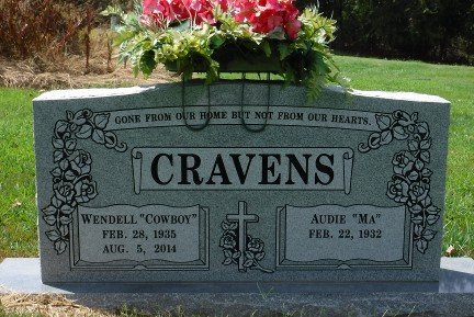Audie is preceded in death by her parents, George and Sally Menie; husband, Wendell Cravens; granddaughter, Kay Rowan; 6 sisters, Lola Stephens, Christine Youngblood, Hazel McDonald, Vera Menie, Louis Stewart, and Thelma Barricks; 4 brothers, Odis Menie, Othal Menie, Leon Menie, and Eual Menie.